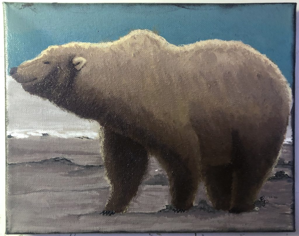 I made paintings for those close to me for Christmas. This friend liked brown bears so I painted her one. I struggled to get the fur to look textured. In my opinion, the background was neglected due to the focus on the fur.