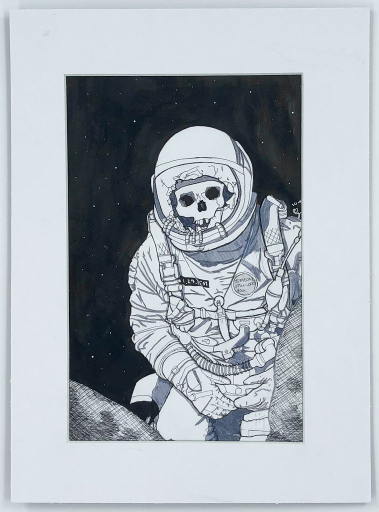 An inked illustration of a skeleton astronaut.