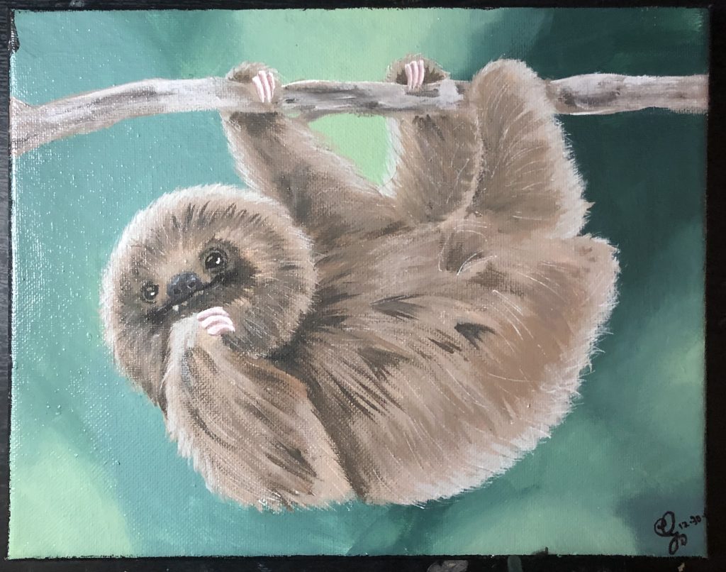 This painting was for an old friend for Christmas. Her favorite animal is a sloth, so I painted one. At the time I’d started working with watercolor so I wanted to use that medium for her gift. I had to spend extra time on this due to being inexperienced with the medium. I used primarily watercolor and then added more detail with colored pencils.